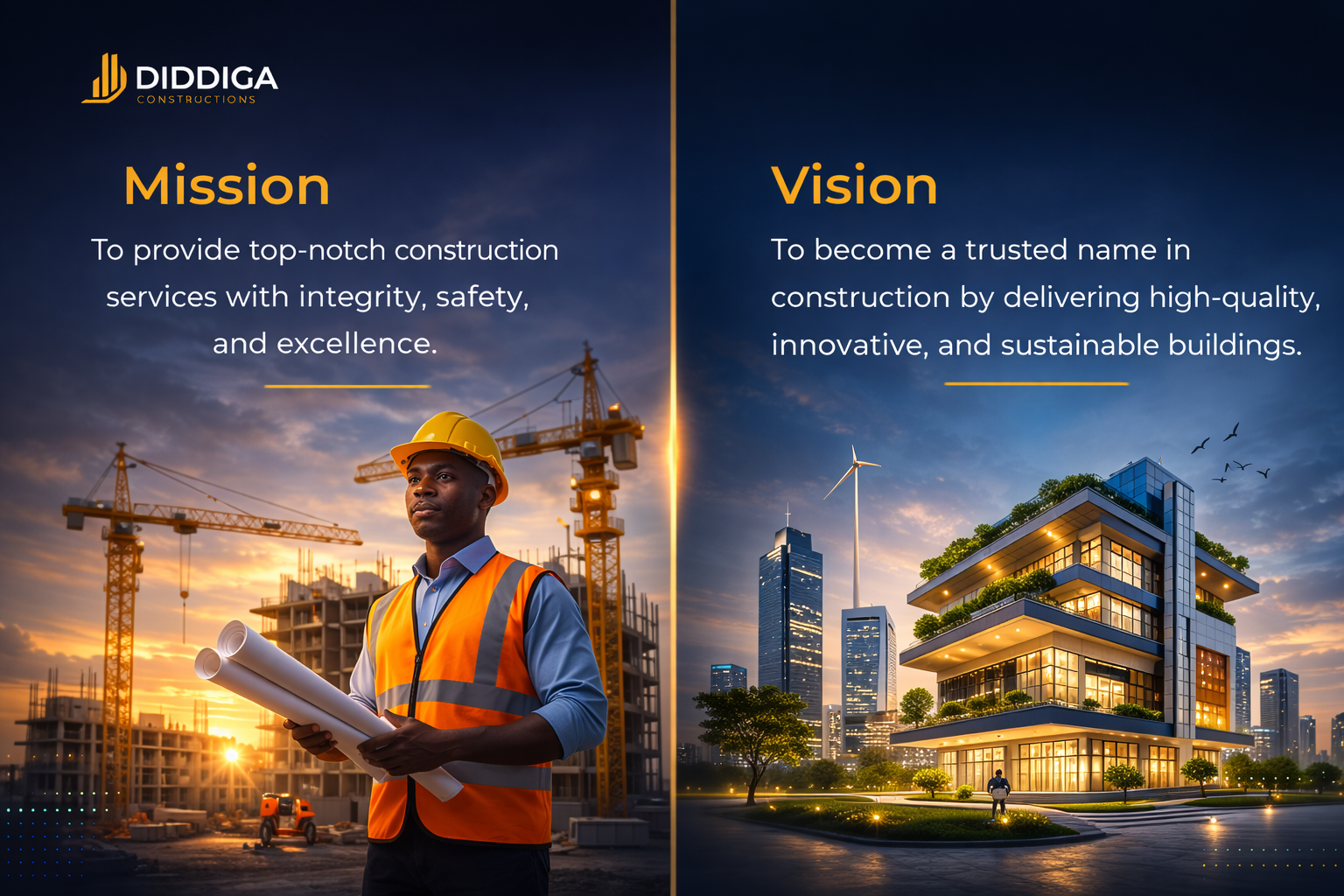 Mission:At DIDDIGA Constructions, our mission is to provide top-notch construction services with integrity, safety, and excellence. We aim to complete every project on time, within budget, and beyond client expectations through skilled workmanship and modern practices.